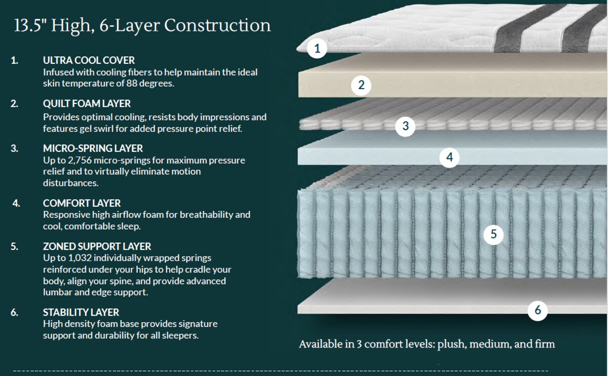 Snuggle into a mattress that cools, cradles, and supports with unbeatable durability. Perfect for every sleep position, it bounces back and keeps up night after night. When it comes to luxury, one is never enough. That’s why this mattress has two layers of over 3,788 micro and zoned springs for premium support. Twin-$1545, Twin XL-$1600, Full-$1825, Queen-$2155, King-$2475, Cal King-$2475. Can be purchased in-store or ordered over the phone and shipped in 5-7 days. Feel free to call 775-379-8175 with any questions or if you would like to place an order.